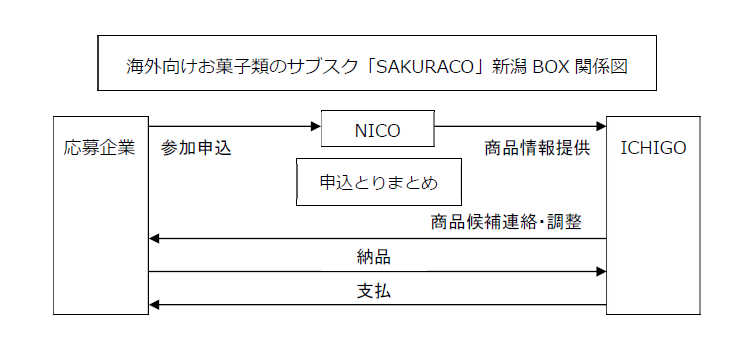 NICOでは株式会社ICHIGOの事業である海外(主に米国)向け菓子類サブスクリプションサービス「Sakuraco」の新潟BOX(2023 年1 月号(2022 年12 月販売))に協力し、海外における県内菓子類・お茶等の可能性の調査や認知度を高めることを目的として参加商品を募集します。