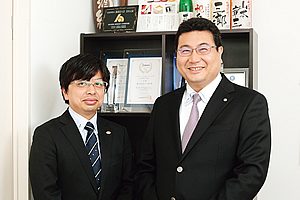 「最初にJETROの担当者から最低5年はかかると言われ、まだ全体売上の2%程度です。ようやく流れが生まれてきて、5年というのはその通りだなと感じています」と話す松本社長(写真右)と海外戦略室の鶴巻氏(写真左)。鶴巻氏は輸出業務の経験はなく、eラーニングなどを活用し独学で貿易実務を学んだ。