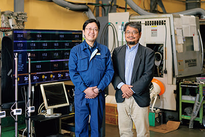 「温度環境を見える化したことで、品質と温度の関係性について社員の意識付けにつながりました」と倉品専務(写真左)。「今後も細かくアップデートをしながら、使いやすいシステムにしていきたいと思います」と、システム開発を担当した川俣氏(写真右)。