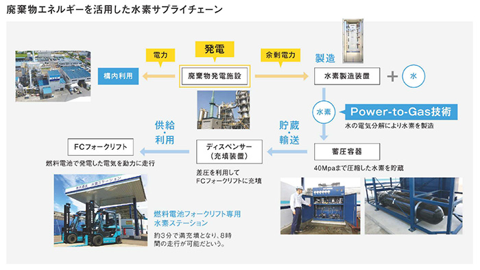 また、同社では2018年に、夜間・休日などに発生する余剰電力を利用して水素を製造、供給する「燃料電池フォークリフト専用水素ステーション」を本社敷地内に設置した。「2号炉が計画された段階で、余った電力を何かに使えないかと検討を重ねてきました。その結果、廃棄物を燃やしてつくった電気で水素を製造し、その水素でフォークリフトを動かして構内で使うという仕組みがいいのではということで、水素エネルギー活用に着手しました」。