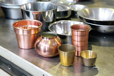厨房用品の加工依頼が多い同社。主に扱うステンレスや鉄をはじめ、銅、アルミなど、様々な素材に対応できるように、職人たちは練習を重ねている。