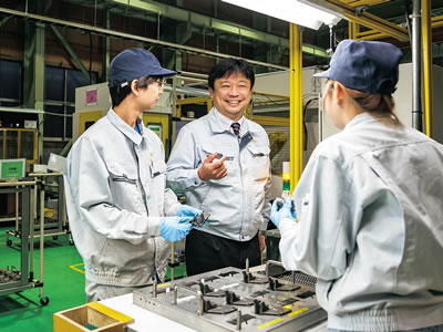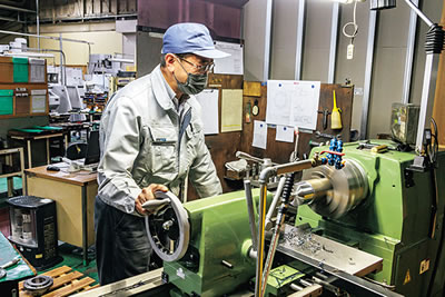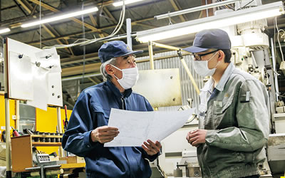 テック長沢が得意とする特殊な金属部品の切削・研削加工では、試作品の設計や小ロット製品の対応、加工に必要な治具部品の製造など、技術者による手作業が欠かせない。ベテランのOBに教育者として入ってもらい、若手社員に技術を伝承する体制をとっている。