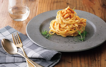 「ネクストシーフードうに風味」で調理したパスタ。本物のうにのアミノ酸成分を徹底分析し、その組成に近づけるように味・食感を再現。本物よりカロリーが低く抑えられる。
