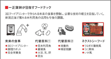 一正蒲鉾は2045年度に目指す事業の在り方を「ICHIMASA30ビジョン」に定めており、その中で食品バイオ企業になることを掲げている。その目標の実現に向け、代替シーフードに留まらず、培養魚肉の共同研究に着手するなど、より先進的なフードテック(※)の取組も始めている。「当社の技術研究部では目先のことだけでなく、2045年の食卓を想像し、そのために必要となる技術の研究を大学や研究機関と一緒に進めています。将来、3Dフードプリンターで料理が作られる時代を迎えた時、当社では材料の提供を担いたいと考えています」。