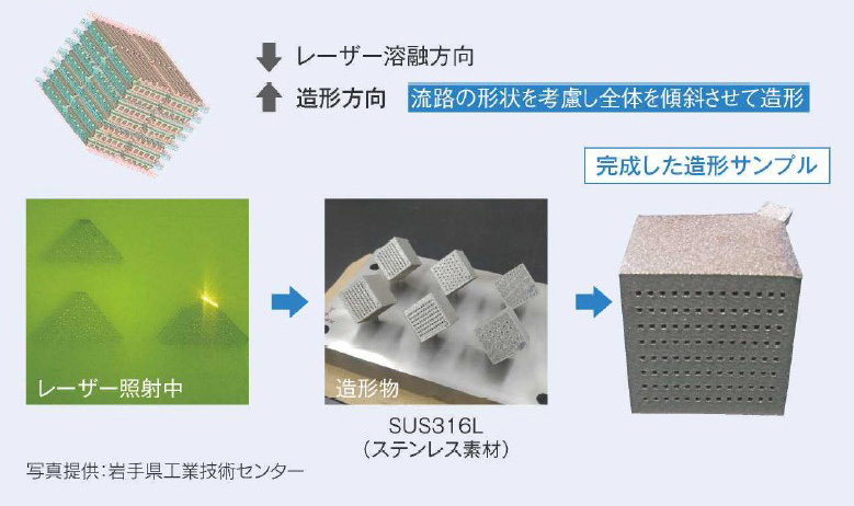 WELCONは今回、内部に細く複雑な流路がある熱交換器にチャレンジした。微細な構造に向くパウダーベッド方式での造形装置が必要となったが、NICOのネットワークを活かし、装置を保有し、高いノウハウを有する岩手県工業技術センターの協力が得られた。WELCONから示したテーマに対し、実際にどの程度の細い穴が造形できるか事前トライを行ったところ、一辺1mm程度の断面ならば途中でふさがることがない流路が作れることが分かった。