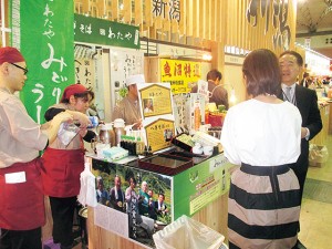 日本最大級の商談専門展示会「スーパーマーケット・トレードショー」に出展。へぎそばと「みどりのラー油」を合わせて試食を勧めたところ、多くのバイヤーに好評だったという。