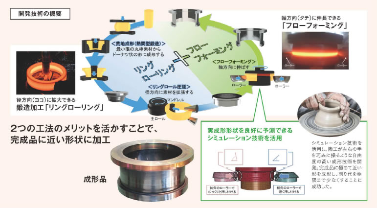 「タンレイ工業さんが得意としているリング鍛造は、棒状の素材をもとに作ったリングをヨコに広げていく加工で、材料ロスは少ないのですが、複雑な形や背の高い形を作るのが難しい。それを補うため、そのリングをさらにもう一回部分的に加工してタテに伸ばせばいろいろな形状に応用できる。その加工がフローフォーミングなんです」と本田主任研究員は語るが、シミュレーションデータで実際の加工をどこまで再現できるかが、一番の苦労だったという。「我々も一つ一つ手探りで解析を進め、そのつど実験をお願いしていました」。