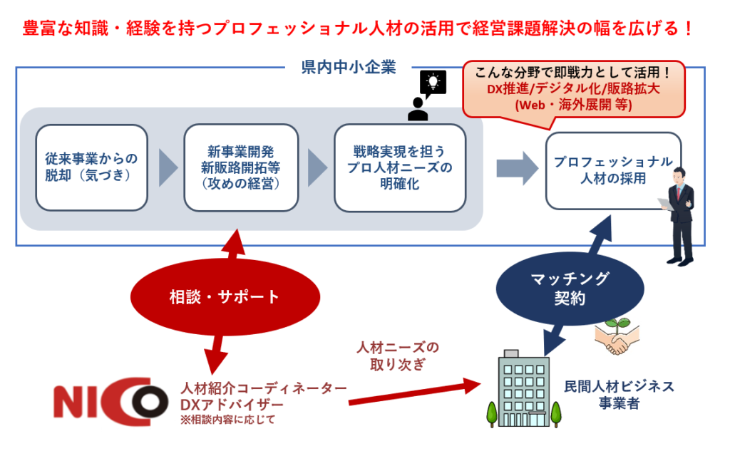 にいがた産業創造機構では、デジタル化やDX推進、新事業の展開、新規販路開拓等に取り組む企業支援の一環として、即戦力となるプロフェッショナル人材の採用に関する相談をお受けします。