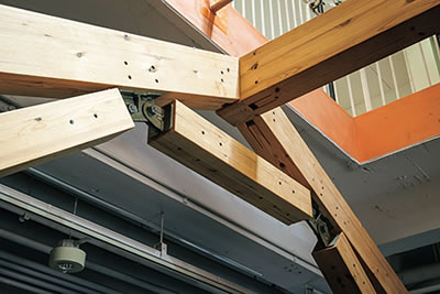 ウッド・ハブでは木質構造建築の構造設計を請け負うほか、接合金具の開発や、建物に応じたオリジナル接合金具の開発コンサルティングも行っている。