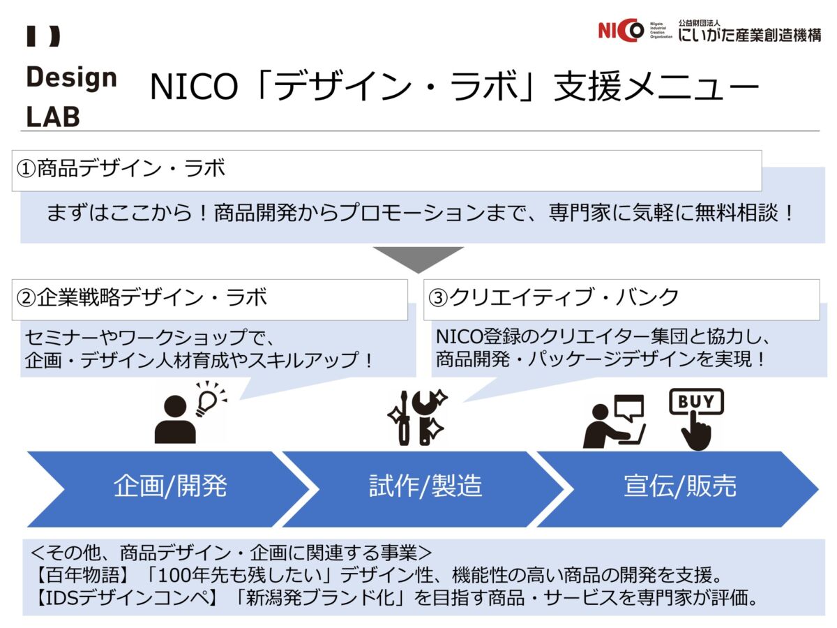 NICOの支援メニュー「Design LAB」では、商品開発、プロモーションから人材育成まで。