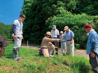 地域住民と一緒に集落環境診断を実施。集落内を歩きながら鳥獣に狙われているポイントを調べ、ワークショップで対策を検討する。