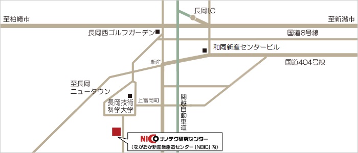 | 〒940-2135 長岡市深沢町2085-16 ながおか新産業創造センター(NBIC)内 【アクセス】 関越自動車道「長岡IC」から車で5分 設置施設(NBIC)のホームページはこちら > |