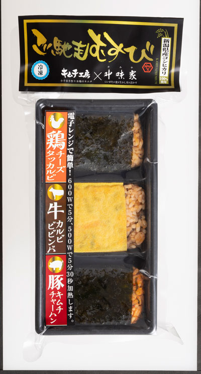 韓国の代表的な3種の料理をおむすびで表現しました。辛さより旨みを追求し、明確な味の違いがこだわりのポイント。雪深い小千谷の大地が育んだ野菜の手作り製法のキムチは保存料を使わず天然塩を使い食べる方の健康を考えて作られているので安心して召し上がれます。お召し上がりの際は袋を1~2cm程切り、そのまま電子レンジに入れ600Wの場合5分間加熱します。袋から容器を取り出し、そのままお召し上がり頂けます。